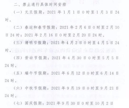 元旦節、春節、清明節、勞動節、端午節、中秋節、國慶節假日期間,全天禁止物品運輸車在高速公路通行;供應自來水生產用的液氯運輸車輛,燃油、天然氣運輸車輛0時至6時禁止通行,其他時段不受限制。