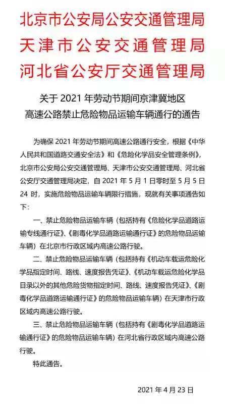 為確保2021年五一勞動節(jié)期間高速公路通行安全,根據(jù)《中華人民共和國道路交通安全法》和《危險(xiǎn)化學(xué)品安全管理?xiàng)l例》,4月23日,北京市公安局公安交通管理局、天津市公安交通管理局、河北省公安廳交通管理局發(fā)布《關(guān)于2021年勞動節(jié)期間京津冀地區(qū)高速公路禁止物品運(yùn)輸車輛通行的通告》,通告決定,自2021年5月1日零時(shí)至5月5日24時(shí),實(shí)施物品運(yùn)輸車輛限行措施。