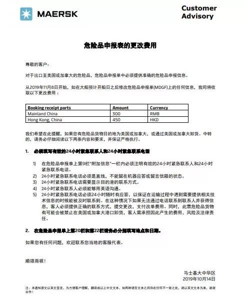出口至美國或加拿大的危險品,危險品申報單中必須提供準確的危險品申報信息。從2019年11月8日開始,如在大船預計開船日之后修改危險品申報單(MDGF)上的任何信息,馬士基將收取更改費。